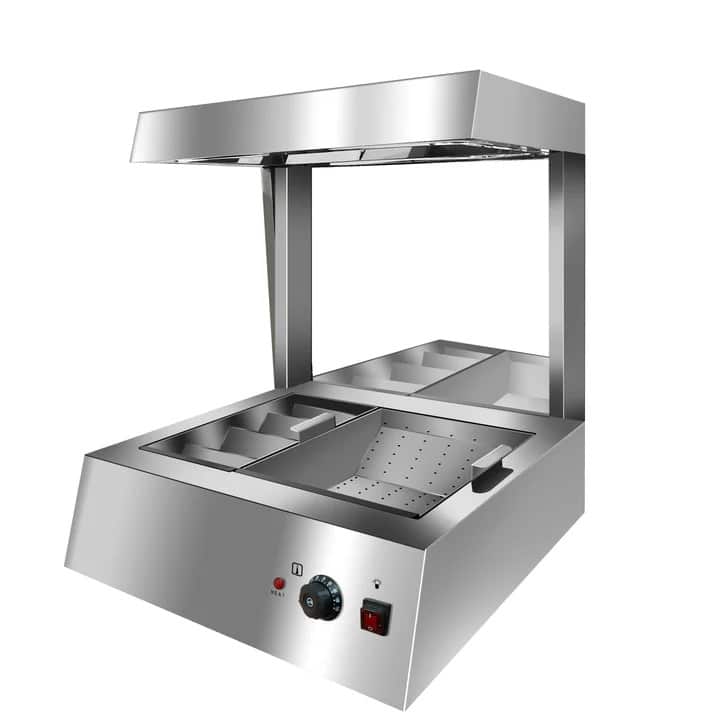 This compact device features an electric heating element and a specially designed container for keeping cooked fries at the perfect temperature and texture until they are ready to be served, an adjustable thermostat, on/off indicator, and removable chip bag support.