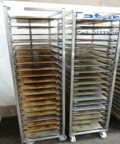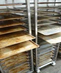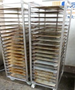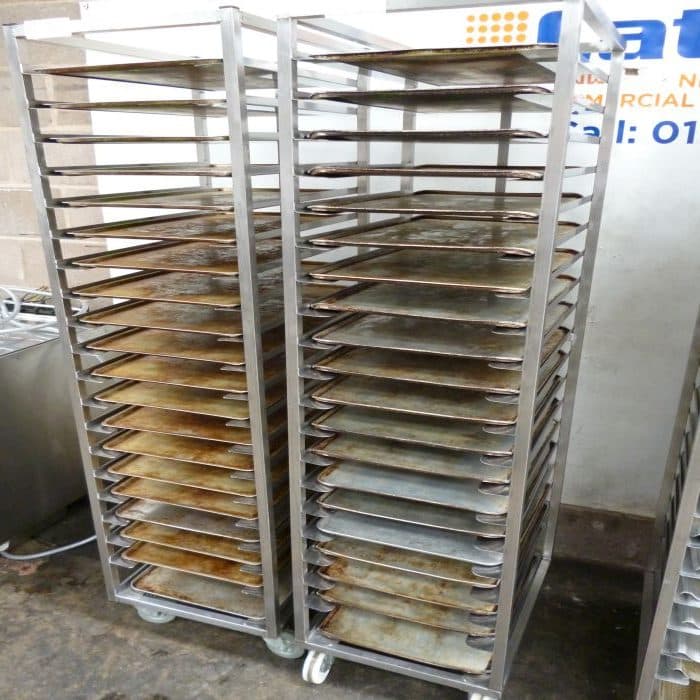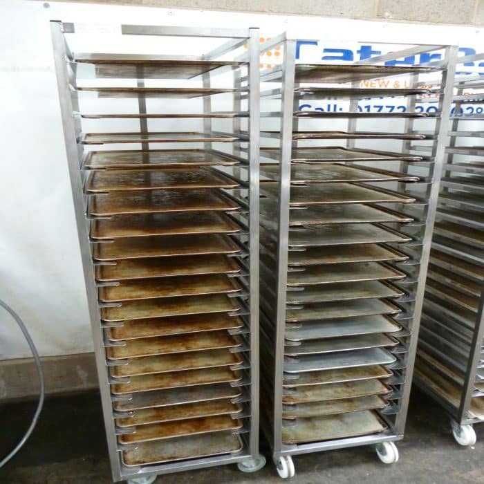 With castors.and used 60cm x 40cm Aluminium Bakery trays