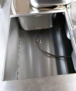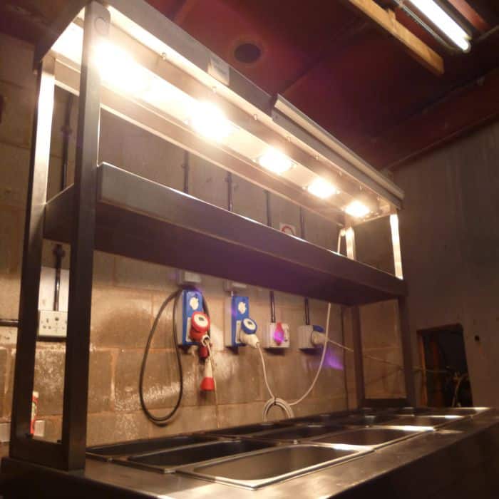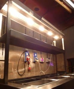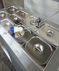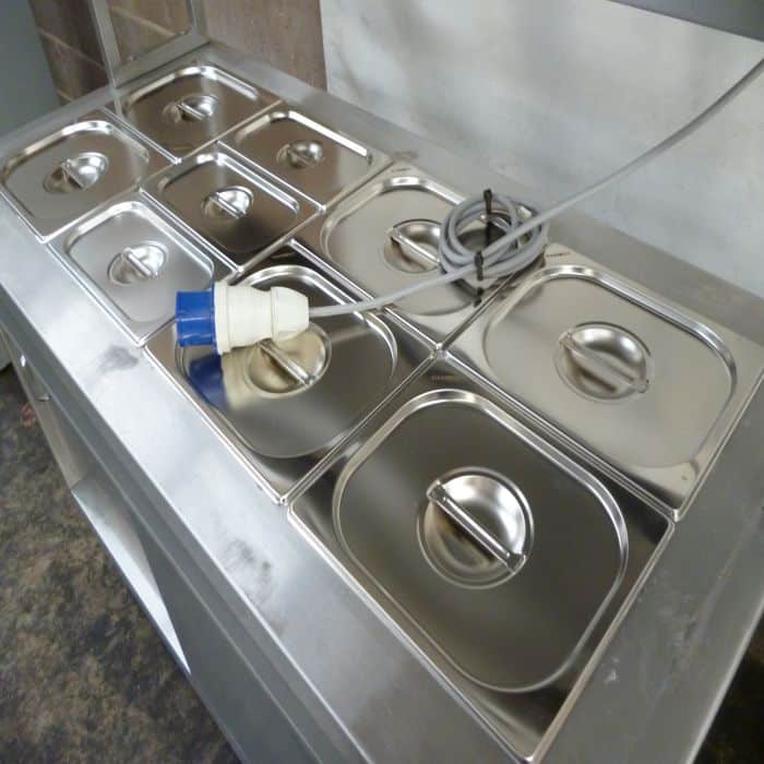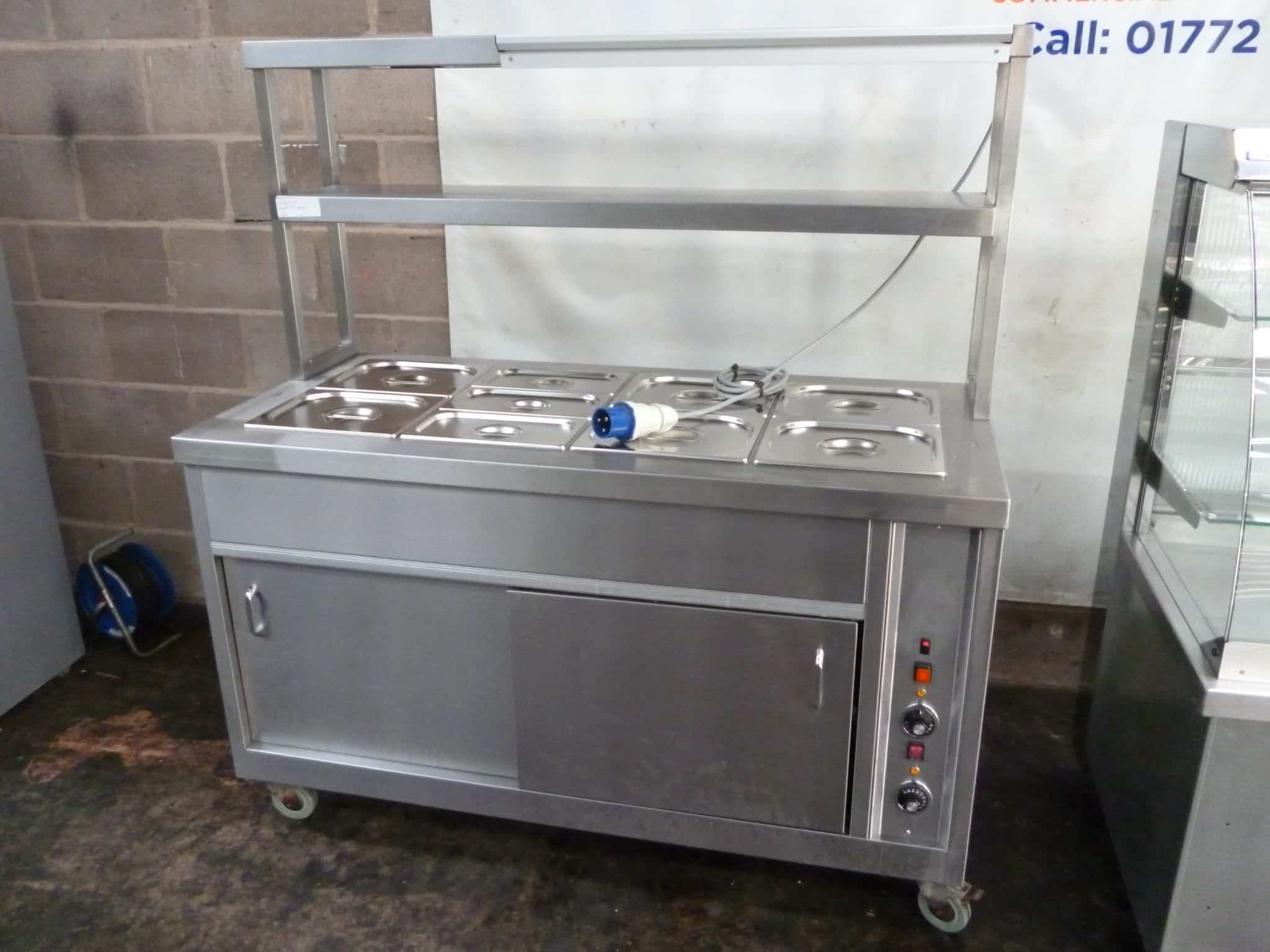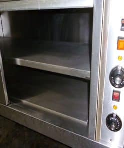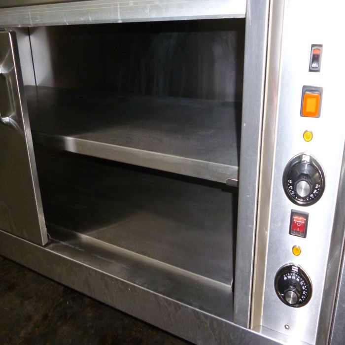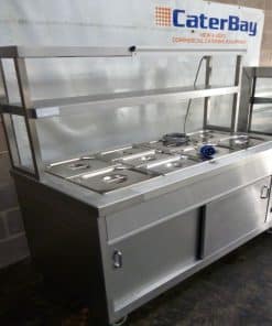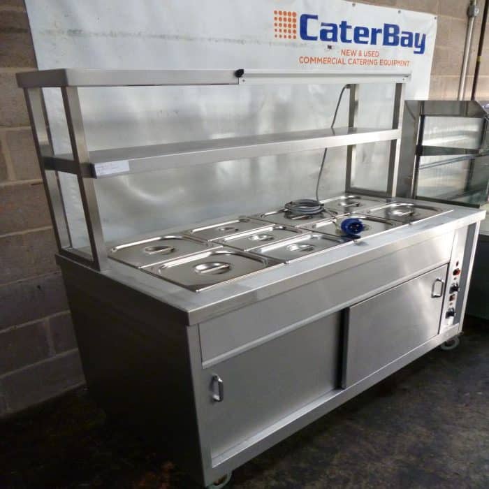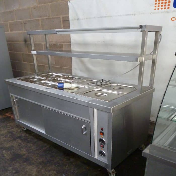 Heavy duty commercial hot cupboard with dry heat bain marie top and hot cupboard under, with two tier heated gantry.  Fully welded construction.